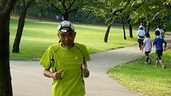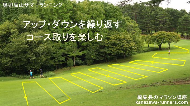 【広い傾斜地を有効活用しよう。】 奥卯辰山健民公園はもとゴルフ場です。現在はグランドゴルフ場として利用されています。ここは有料営業なので、ランニングコースとして使えない部分です。以前は走れていたのですが狭くなりました。ここでラン練習している皆さんは、丘陵公園を一本道でコース取りして、周回数を楽しんでいるようです。私は撮影の時は、皆さんに合わせてコース取りします。居残り練習では、アップ・ダウンを繰り返すジグザグのコースを取ります。体のバランス能力を高め、軸を強化する目的です。上り坂でも小刻みにアップ・ダウンするコース取りをすれば楽に走れるものです。広い斜面をこうしたコース取りすれば1周でも2周分の距離練習になります。 |