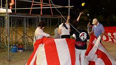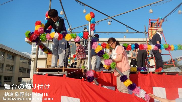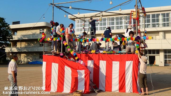 | 朝6時。舞台の飾りつけ。 | 会場は泉野小学校運動場 | |