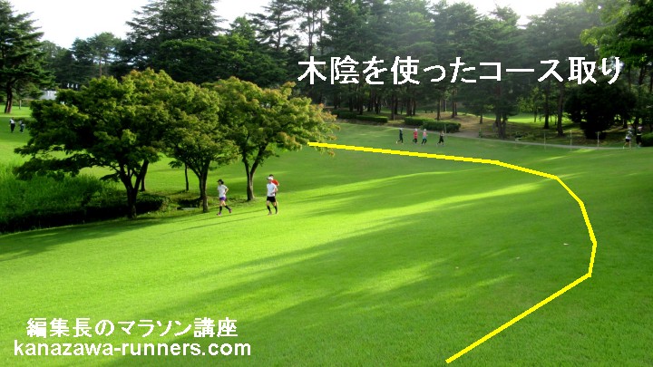 | @練習ラン(ジョギング)は、少しでも不整地を選んでコース取りする。 不整地=芝生・土・砂利=ロードを走るときに入らない筋肉に刺激を加える。 |