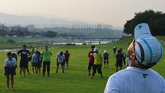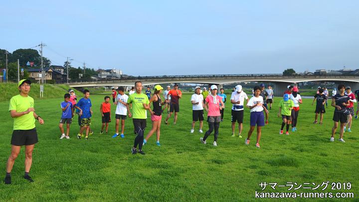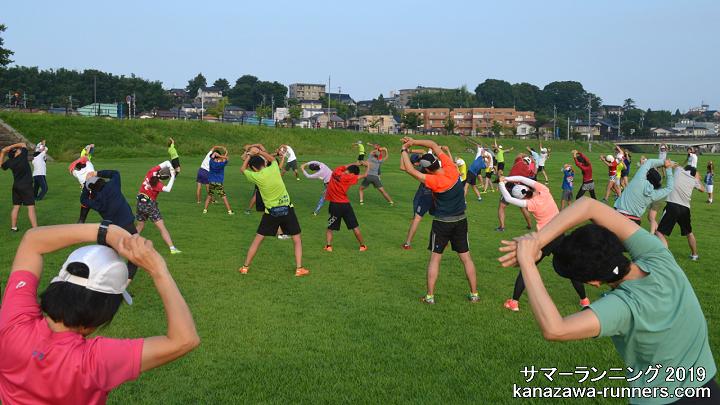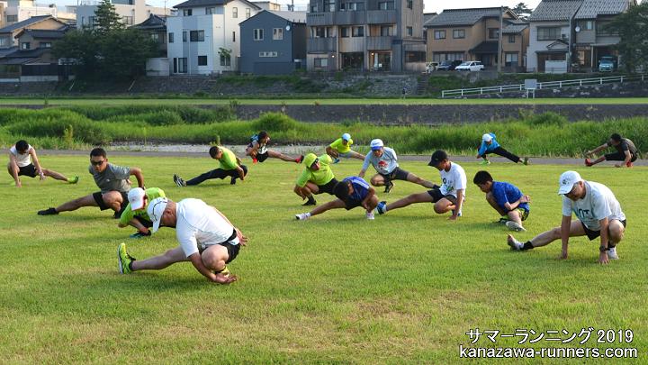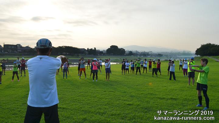 | 連日真夏日の暑い日が続いています。サマーランの会場は、左岸の河川敷。私の練習コースは犀川右岸の河川敷、上菊橋から御影大橋の間で、たまに右岸を走ります。いつもは夕方ランですが7月中旬から早朝ランに切り替えています。 今日はMTB(自転車)で会場入り。芝生はシッカリと伸びて、奥卯辰山健民公園のよう。朝礼・軽ジョグ・準備体操のあと、集合写真を撮影しました。この後、クラス分けして自由ランニング。私はカメラを置きに一度帰宅。身軽になって、いつもの河川敷コースへ8kmラン。自由ランのみなさんと合流する頃には気温は34℃に上がっています。今日の練習は、ラン=10km、MTB3km。 ※自由ランの撮影を省略しました。私も練習として走りたいのと、汗でカメラが濡れるためです。 5日(火)に事務局長からメール。次週から会場を奥卯辰山健民公園に戻すことになりました。 |
