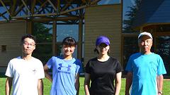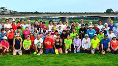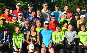 サマーランニング恒例の集合写真。2004年から撮影を続けています。これまで撮影者として専心、16年間で私の加わった写真は1枚もありません。74歳の今、いつまでもこのスタイルを続けるとチョット寂しい気持ちになるかもしれません。今回、野尻あずささんのクロカン教室は、自分でもシツコイと感じるほど密着撮影しました。ワガママをいって真ん中に入れてもらって写真に納まります。撮影は取材にこられた新聞記者さんです。 |