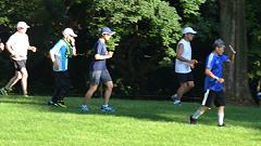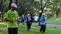 【広い傾斜地を有効活用しよう。】 奥卯辰山健民公園はもとゴルフ場です。現在はグランドゴルフ場として利用されています。ここは有料営業なので、ランニングコースとして使えない部分です。以前は走れていたのですが狭くなりました。ここでラン練習している皆さんは、丘陵公園を一本道でコース取りして、周回数を楽しんでいるようです。私は撮影の時は、皆さんに合わせてコース取りします。居残り練習では、アップ・ダウンを繰り返すジグザグのコースを取ります。体のバランス能力を高め、軸を強化する目的です。上り坂でも小刻みにアップ・ダウンするコース取りをすれば楽に走れるものです。広い斜面をこうしたコース取りすれば1周でも2周分の距離練習になります。 |