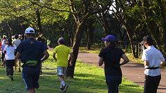【居残り練習は木陰ランで。】 8時を過ぎると気温もあがり日差しも強くなってきます。公園には樹木が多く、木陰の帯が沢山できています。こうした場所で上記のジグザグ走をします。100mくらいの距離が取れるところは往復を数回繰り返します。起伏を利用して体幹を鍛える、股関節を使った走り方、下り坂を利用したスピード走など、ここでの練習目的を決めています。基礎的な動きを毎年確認し、秋からの持久走にそなえます。 |