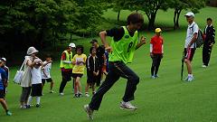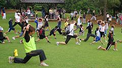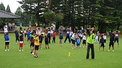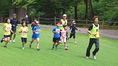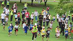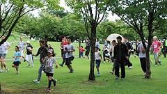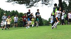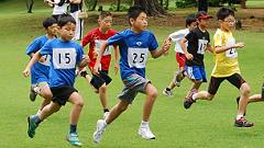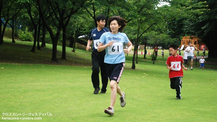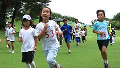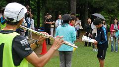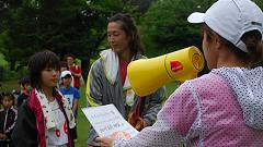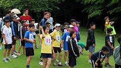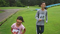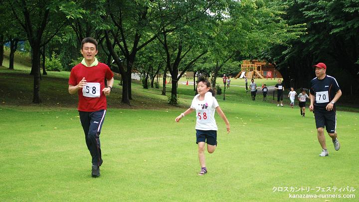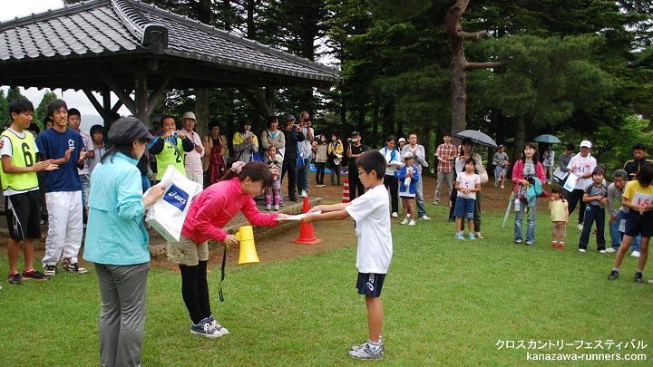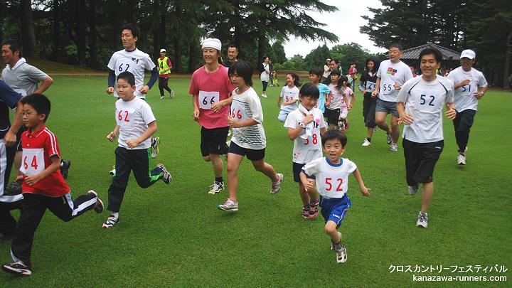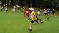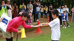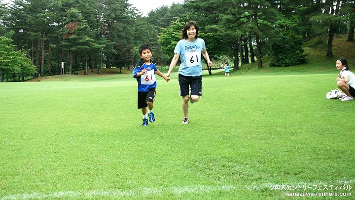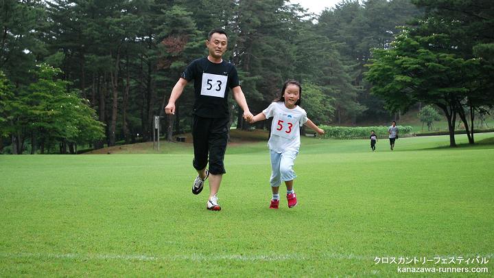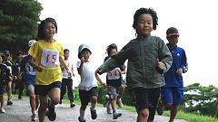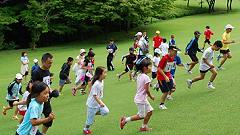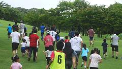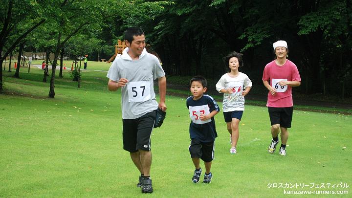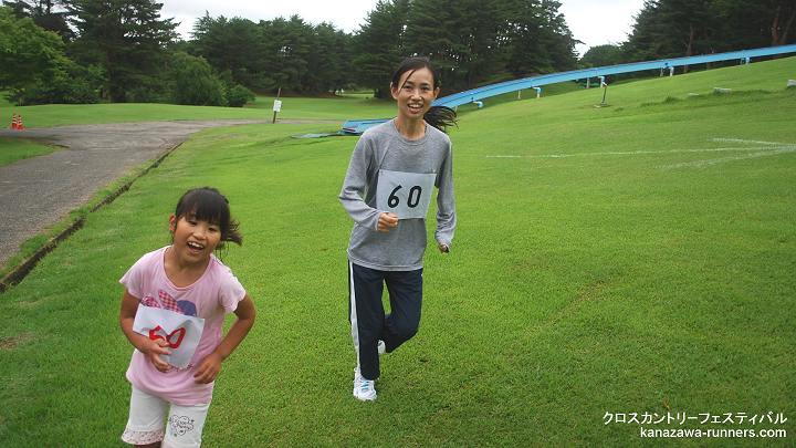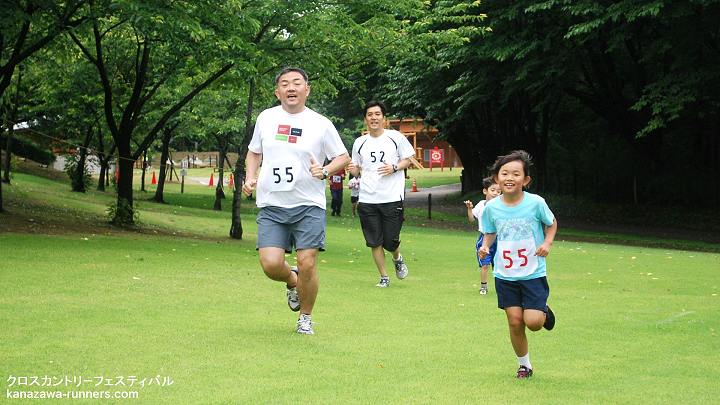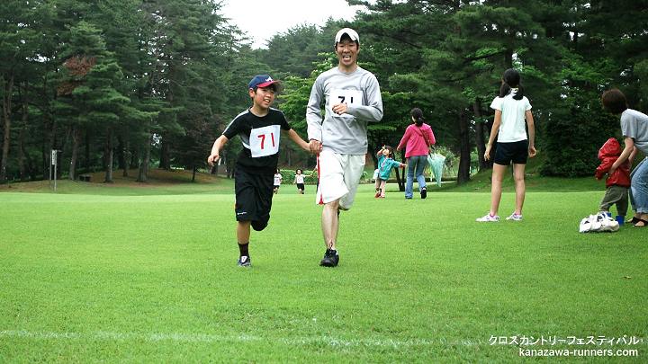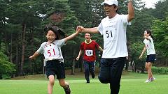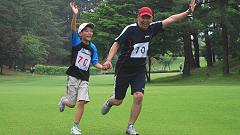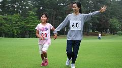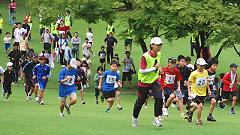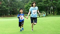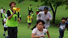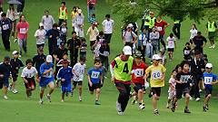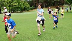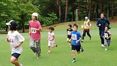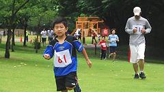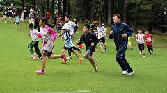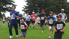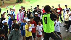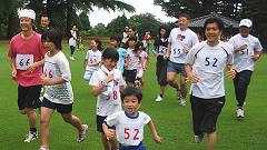 | ランニング教室の後、競走大会が行われる。小学生個人の部が男子・女子の2つ。続いて、ファミリーの部。ファミリーの部の制約は、親子で一緒にフィニッシュしなければならないこと。子供が先に走って、フィニッシュラインでしばらく待つシーンもありました。 | ||