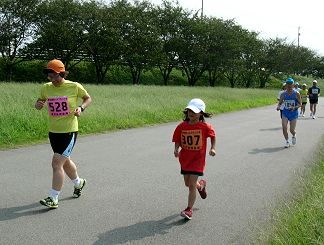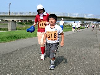 | 岐阜県から参加。芝生でくつろぐTさん家族 | 力走する瑠麻くん(10歳) | ||