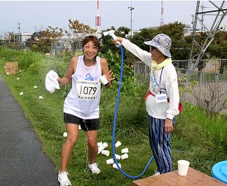 完走後給水の岩橋キクさん(82歳)。右奥は看護婦さん。 |