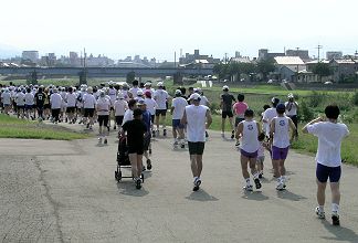 | 健民トリムマラソン大会は石川県健民運動推進本部の主催で、金沢中央走ろう会が主管しています。トリムとは、整った状態の意で、心身の調和と健康増進のため各種の身体運動を行うことを狙いとした大会などに使われています。 大会参加を通して、心と体のバランスのとれた健康づくり。さわやかランニングを楽しみましょう。 初秋とはいえ、スタート時から30℃を越す暑い大会になりました。こういう日こそ、ペースを落とし、給水をシッカリ摂るなど、無理をしないで楽しむゆとりが大切です。 写真マラソン2005:健民トリムマラソン大会編は、家族で楽しむランニング・高齢者の皆さんのマイペースランニングをテーマにした特集です。 |