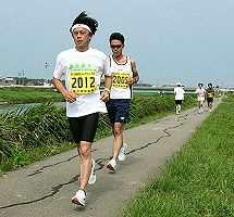 | スタートし、上流に向かうランナーの列 | 上流に向かうスタートの末尾。暑い時こそマイペース。 | ||