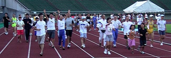 17時を過ぎると、もう夕方の気配です。太陽の動きはすでに秋になっています。 18:00。10時間におよぶリレー大会の終了時刻です。ピストルを合図にランニングを停止。配置された係員が各ランナーの周回数と端数距離を計測します。 トラックの最後尾のランナーからフィニッシュランをスタート。他のランナーや応援の皆さんも参加し、一緒になってトラックを一周します。笑顔がいっぱい。楽しい大会のフィナーレです。 |
