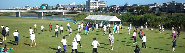| 大会場全景。児童会館前の広場。準備体操は恒例のエアロビクスです。 | |
