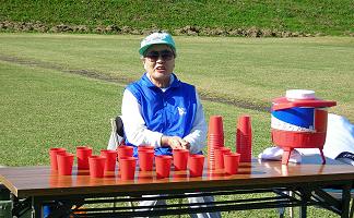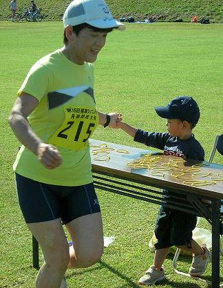 | 周回の輪ゴム渡しを手伝う颯吾君(4歳)。おばあちゃんは3時間走です。/エイドは私におまかせください。 | |