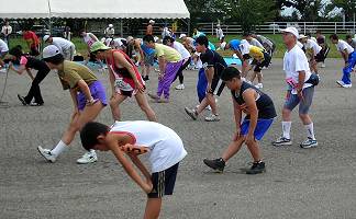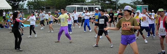 | ランニング前の準備体操はエアロビクスです。インストラクターは毎回お馴染みのHさん。大会常連の皆さんは足取りも軽やかです。時間をたっぷりかけているので、20km出場のランナーは走る前に疲れないようにしましょう。 初秋とはいえ、連日、残暑が続いています。幸い暑さも少し和らいで、走りやすくなりましたが、25℃を越す気温には熱中症対策の水分補給が不可欠です。 ランニング前の給水はランナーが準備するのが普通ですが、今回はスタート地点に給水コーナーを設けました。2.4km走れば最初の給水所で、我慢することもできますが、走る前に水分を摂っておくことの大切さを理解し、習慣にしてほしいことです。 |