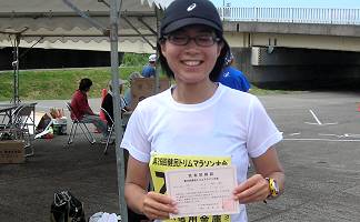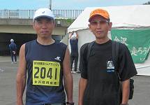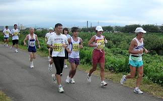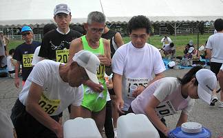 | いつも元気な長老会員に感心します。最長老の清水さん(97歳)は、本部席で天野顧問と応援。岩橋宗一さん(90歳)キクさん(84歳)夫妻は大会役員で参加です。宗一さんは上流側でランナーを応援しながらの監察、キクさんは上流側給水所でサービス。氷で冷やした水が暑いランニングの助けになりました。 12:20。20kmの部、Yさん(69歳)が最終ランナーでゴールイン。タイムは2:50、今日の暑さに歩きが入ったようです。20kmの部の最高齢は石川さんと生水さんで、いずれも73歳、無事完走されています。 |