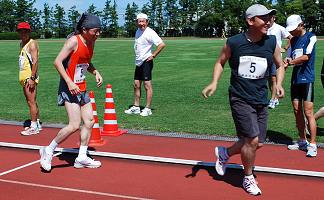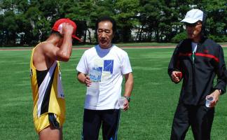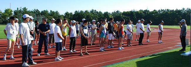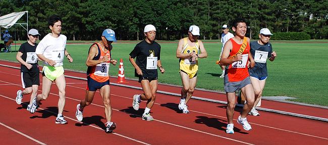 例年9月の第1日曜日に開催しているリレー大会ですが、今年は9月7日が金沢城下町ハーフマラソンと重なります。9月23日にトリムマラソン大会の開催を控えていることから、14日の週にもってこれません。という訳で8月末の開催となりました。 会場も昨年と同じく陸上競技場がサッカー大会で使用されるためサブグラウンドでの開催となりました。こちらはスタンドがないので、緑に囲まれたトラックは風の通りも良く気持の良いものです。休憩場となる雨天走路も北向きですが、スタンド下と違い、明るい雰囲気です。サッカー開催中で、競技場の脱衣室・シャワーが使えないのが、不便なところです。ホースやバケツを利用して汗を流します。 気温は昨年と同じような状況で、会場での測定は30℃を越しています。風はしっかりありましたが、風向が安定していて、バックストレートはいつも追い風。この区間がとても暑いランニングとなりました。 |