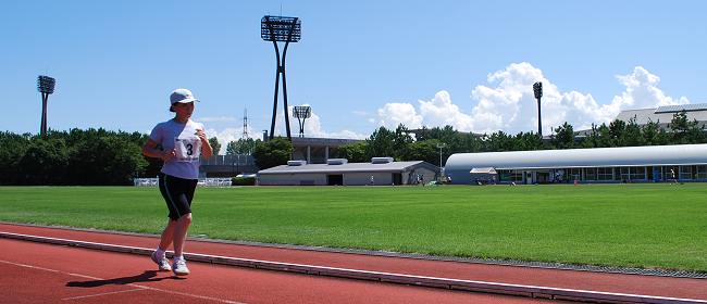 この大会の特徴は、秋のマラソン大会シーズンの初期に、仲間との練習の場として利用できることです。独りの練習にはない緊張感と楽しさが加わります。一般のランナーにはなかなか競技場を走る機会はありません。トラックの感触を楽しみながら脚にやさしい練習ができます。私は、シーズン初めのスピード練習の一環としてこの大会に参加しています。夏季の暑いシーズンは5:30〜6:00/kmのペース。これから涼しくなってきて、大会参加に向けてペースアップと距離走の練習を組んでいきます。その恰好の練習機会がこの大会です。トラックを使ってスピード(?)練習が目標です。 傍目から観られても余裕のありそうな走り方をしたいと考えています。気持の余裕がある走り方には効率的な走り方が不可欠です。特に秋口のシーズン初めには大切な確認項目を意識した練習を心掛けるようになりました。重心の置き方、着地の流れ、腕の振り方などを意識して一歩一歩の走りを大切にします。特に今年の5月からは、体幹を使った跳びをしようと着地時の軸を意識しています。こうすることで、スピードを一定に保つことができます。それをトラック1周ごとにラップ測定して確認します。 10時間の部の中央走ろう会で3回の出場枠でしたが、17時からの枠は、最終のリレータイムの撮影があるので、外してもらいました。 朝から雲ひとつない青空です。まさに快晴。暑くなりそうです。30℃ちかい気温なので、5分/kmのペース(トラック1周を2分で)が保てるか、様子をみることにします。 最初は3枠(9:30〜10:00)に出走。1周目は1分50秒。ちょっと入りが速かった。2周以降は2分ペースにします。30分間でのトラック周回数は15周(6km)でした。トラック1周ごとのラップ計測ではコンスタントに2分ペースで、バラツキは2〜3秒以内です。この気候で目標通りの平均5:00/kmペースでいけたので、今日の成果はまずまずというところ。昨年の経験からもハーフやフルマラソンのタイムを維持できそうな感じです。 8枠(11:30〜12:00)は金沢ランニングクラブのピンチランナーで出走し14周(29分)。3回目の11枠(14:00〜14:30)では14周(29分)。いずれもリレータイムの関係と気温の一番高い時間帯との兼ね合いでした。発汗量が多く、給水を4〜5回入れたのがタイムロスの一因です。それでも1周2分5〜6秒のペースを維持できました。 今日の目標走行距離は45周分(6km×3回=18km)でした。ウォーミングアップとクーリングダウンでトラックを各1周したので、予定とおりの距離になりました。 |