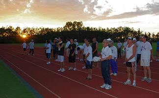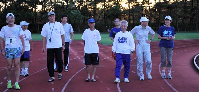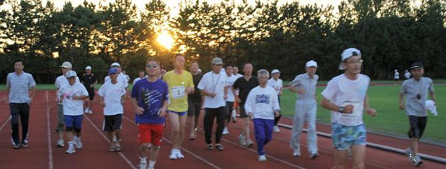 17時を過ぎると、もう夕方の気配です。太陽の動きはすでに秋になっています。あれほど暑かったトラックも爽やかなランニングを楽しめるようになっています。 18:00。10時間におよぶリレー大会のフィニッシュタイムです。ピストルを合図にランニングを停止。配置された係員が各ランナーの周回数と端数距離を計測します。この間に、最終ランナーの停止位置に仲間のランナーや応援の皆さんが集まります。トラックの最後尾のチームからフィニッシュランをスタート。合流しながら、一緒になってトラックを一周します。笑顔がいっぱい。楽しい大会のフィナーレです。 |