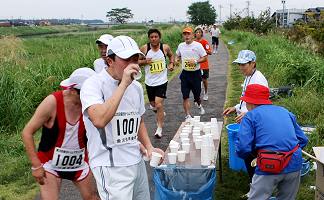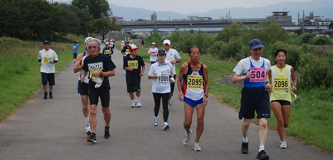 私は大会記録担当として会場準備から最終ランナーのフィニッシュまで撮影し、『楽しく走るを』テーマに編集しています。今回も、家族で楽しむランニング、マイペースランニングを楽しむ皆さんの様子を中心に撮影します。 秋分の日、早朝から断続的に小雨模様です。このくらいの雨は、走りやすいのですが、カメラには大敵です。この大会は2004年から写真取材していますが、今回、初めての雨模様の撮影です。一眼レフカメラに手製の防水カバーを取り付けます。 スタート間もなく雨も上がって曇空のランニング日和となりました。私は20kmの部に参加しながら、撮影取材します。最初の10kmはマウンテンバイク(MTB)でランナーの列を追います。次の10kmはコンパクトカメラに持ち替えて、ランニングしながら撮影します。 昨年まではランニング取材、上流折り返してスタート会場に戻るまでの2kmを一眼レフカメラで、その後はコンパクトカメラに持ち替えました。9月初めにMTBで転倒し、肩の打撲で腕振りができないことから、体への負担軽減策として、MTBを利用することにしました。 |