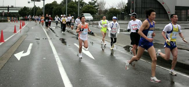 | ●30分経過。走行ペースは順調でGPS時計の表示では100mの進みです。途中から10分後にスタートした10kmの部の選手が追い越していきます。 高橋選手に追いつかれるのはいつだろう。と後方を気にしながら走ります。私のペースが5分30秒/km、高橋選手はゆったりペースで4分/kmくらいか。 T/(5分30秒/km)=(T-10)/(4分/km) この計算式を解くと、T=36分40秒となる。 後方がざわついてきました。高橋選手の笑顔が私の真後ろにあります。さっそく、『写真撮りま〜す』とカメラを向けると、手を振りながら笑顔で応えてくれます。シャッターを切ります。もう1枚とカメラを向けると、画面に『手ブレです、保存しますか』のメッセージ。YESボタンを押してから、ダッシュして撮影のできる距離を確保します。シャッターを押したのですが、タイムラグで的外れの写真です。もう一回。『うまく撮れましたか』。『写真を撮りながら走るなんてすごい』。そして『お父さんガンバッテ』の声を残して追い抜いていきました。 高橋選手の後姿を撮影して、しばらく息を整えながら走ります。GPS時計を見ると150mの進みです。高橋選手の前を走って写真を撮るのに、お父さんならぬ60歳のおじいさんが、これだけのスパートをかけたのです。ここでのエネルギー放出は最後の4〜5kmでのペース維持がきつくなるかなと考えながら、先ほどの写真を確認します。ここで撮影を終え、カメラをポーチに仕舞います。 ピンボケで流れた画像。後姿の写真もレンズに雨の水滴がついたのか雲がかかっています。写真が趣味の編集長としては、使いたくない失敗作ですが、走りながら撮った証拠写真ということで掲載しました。雨天の早朝ということで、スタート時に普通モードにして撮影したまま、スポーツモードに切り替えなかったことが失敗の原因です。 |