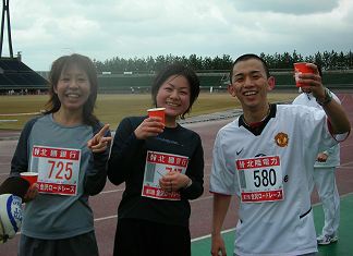 | フィニッシュ後、後続のフィニッシュシーンの撮影をと考えていましたが、風邪をひいては元も子もありません。同じ時間帯にフィニッシュしたベテラン・羽咋のKさん、ハーフに初挑戦で完走を喜こんでいる若者の写真を撮らせていただきました。 | |