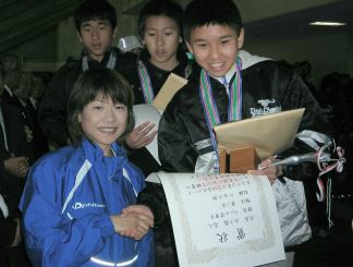 | 黄砂にけむる大会場 | 表彰式後、高橋さんの笑顔 |