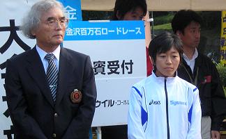 ●秋の好天が続いています。秋季中盤のタイムチェックにいつも参加している百万石ロードレース。前回は、野口みずきさんが招待選手とういこともあり、取材ランでタイム更新ができなかったので、1昨年のベストタイム1時間50分切りに挑戦です。 今回の招待選手は、千葉真子さん。5kmの部に出場です。開会式では笑顔と元気な声で選手達を激励します。撮影はここまで。カメラを貴重品預けに渡し、簡単なウォーミングアップをしながらスタート地点に向かいました。(会場までの自転車こぎがいつものウォーミングアップです。) ●この大会は、給水個所が10km・15kmの2箇所。10kmまでないのが辛い。カメラ代わりにドリンクパックを携帯して走ります。前半の上り坂も順調にこなし、気持よく後半を走れて、タイムは1時間49分10秒。スタートラインからの自己計測では1時間49分00秒。少しづつですが、タイムが良くなっているのが楽しいところです。