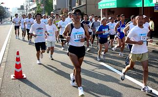 | ●市街地中心から一気に郊外へ抜けるコースです。 折り返し点は上辰巳町。兼六園に導かれる辰巳用水沿いのコースを走ります。スタート地点は小立野台地の先端部にあり、ここを下って周回後、南に向かって標高差100mを上ります。下辰巳からは郊外の雰囲気です。展望も開け、犀川や丘陵地形・山波みを楽しみながら走ります。 8kmで100mの上り坂がこのコースの特徴で、これをシッカリ走りきらないと制限時間で脚切りされます。ここで体力を使い切ると、後半の下り坂を利用したスピードアップに対応できなくなります。けっこう手ごわい大会ですヨ。 |