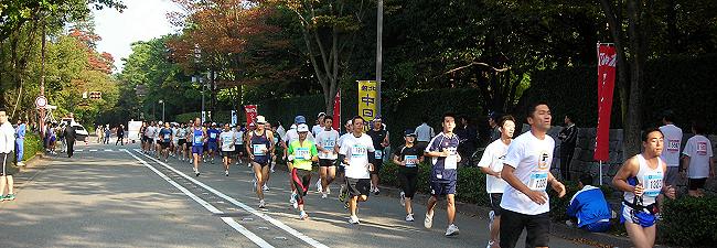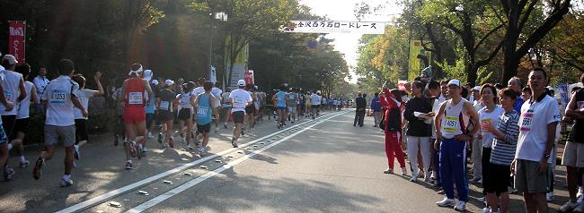 | もう一度スタート地点を通過する頃(約1km)には列が長くなっています。ここまで序走、これからがレースです。 | |||