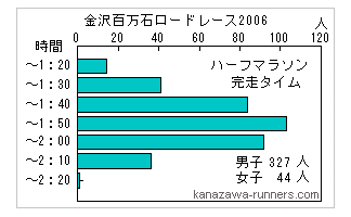 | 秋の好天が続いています。昨年に比べ気温は1〜2℃低く、湿度も走りやすい条件です。笠舞から上辰巳への8kmの上り坂では正面から太陽光を浴びますが、気持のよいランニングでした。 昨年の完走タイムグラフと比較しても成績が良くなっています。皆さんも走りやすかったのではないでしょうか。 |