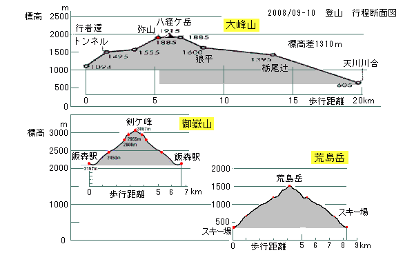 | 【参考】9〜10月の登山記録から:行程断面図 | ||||||||||||||||||||||||||||||||||||||