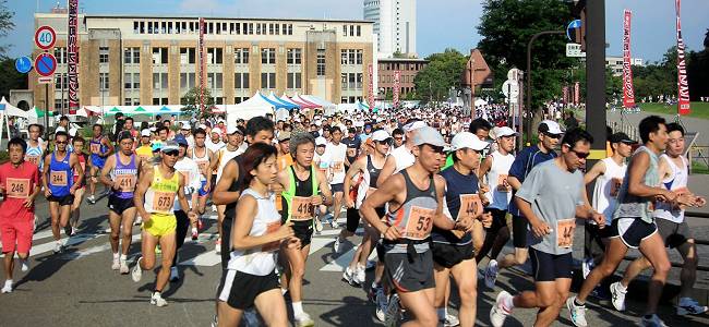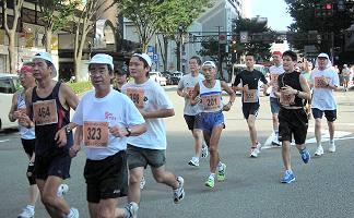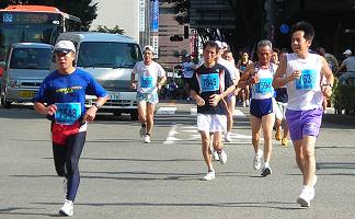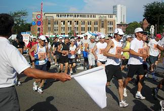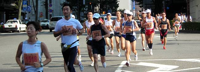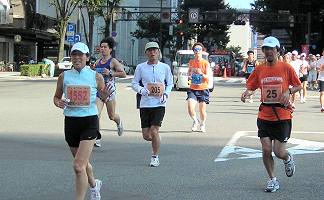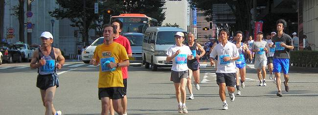 | 【残暑の厳しい大会には十分な給水を】 第1回大会は、現在のコースよりもアップダウンが多く、30℃を越す炎天下の大会でした。沿道の人たちが、ホースでシャワーや給水してくれて、とても助かりました。それでも、石引通りで脚に痙攣がきて苦労したのを覚えています。沢山のランナーが途中棄権や脚切りにあっています。招待選手の有森裕子さんも音をあげた大会です。翌年からコースが変更になりました。 こうした猛暑の日には給水ヶ所も増やしてもらいたいものです。私は、この経験からドリンクパックを必ず携帯して参加しています。このコースでは、各給水所の中間で飲んでいます。最後の給水所(錦町)を過ぎて、小立野から石引あたりで最後の水分補給をすると、気持の余裕も出て、ランニング後の体調も楽になります。早めの水分補給はとても大切な体調管理です。 |
