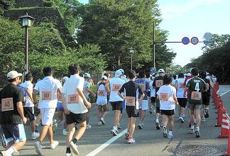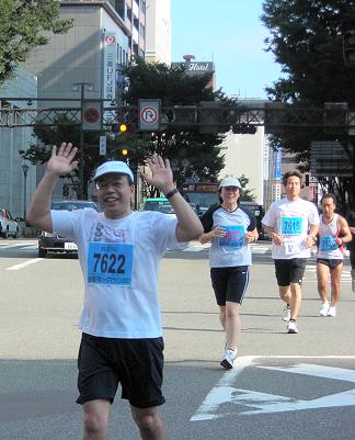 | 城下町HMの第1回は2001年です。私は、続けて3回参加しています。その前身の辰巳用水健脚マラソンから参加していましたが、2004年から応援側に回っています。大会に出なくなったのは、走ろう会に入会したことで9月の大会行事が増えたからです。それと残暑の大会で、体への負担が大きいこともあります。そのかわり、大会前の時間帯にレースコースを走り、会場に戻って、仲間や知人を応援します。石引通りを走っていると、『アレッ、もうトップランナーが来たのかい』と勘違いされることもありました。 |