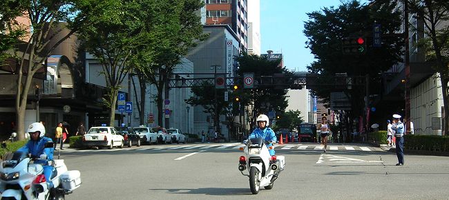 | 香林坊交差点にトップランナーが来ました。後続との開きが大きい。 | |