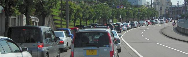 | 石引1丁目の交通規制で、笠舞3丁目からの上り坂は車の数珠繋ぎ |