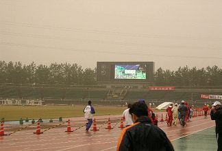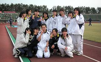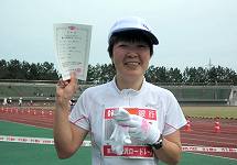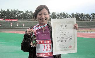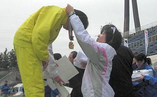 | 黄砂にけむる大会場 | 表彰式後、高橋さんの笑顔 |