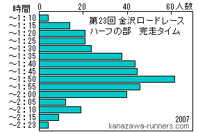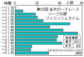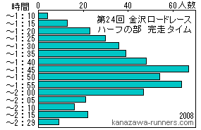 今回の気象条件の特徴は、気温と風。寺中交差点から福増町南交差点までの南南西に向かうほぼ直線の開けた区間で強い向かい風になっていたことだ。アメダスの記録を見ると風向は南南西。まさに正面からの風になる。平均風速も16mを記録している。最大風速は20m台が頻繁にあり、30mを記録した時もある。 スタート時の小雨も早々に上がり、気温も20℃と5月並み。風が強くても気化熱による寒さを感じなかった。 フィニッシュタイムの分布をみると2007〜2008年大会と山の形も違っている。2時間15分以降のフィニッシュも多い。 |