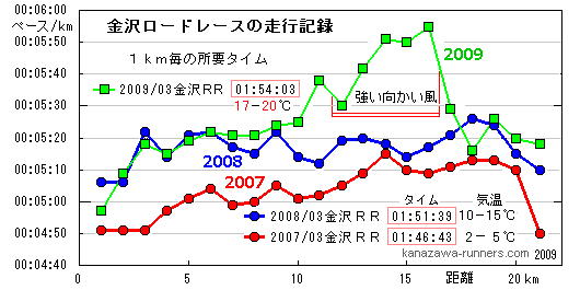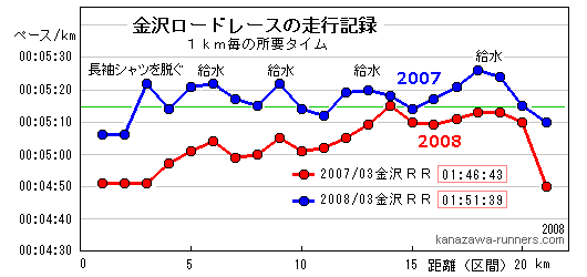 | 昨年は2月に東京マラソン(参照:写真集)が入っていることが大きなポイントだ。1月に過去最高の216kmの走りこみを済ませ、2月は東京マラソンとその後の調整で157km。体重も62.5kgと絞っていた。3月はフルマラソンを走った勢いがあるので、ゆとりのある調整で、金沢RRに臨んだ。気持よく走れて、1時間46分43秒。ハーフのベストタイム更新となった。ペース記録をみると4分台が5区間もあるのはかってないペース配分だ。すべての区間で5:15/kmをクリアできている。 | ||||||||||