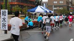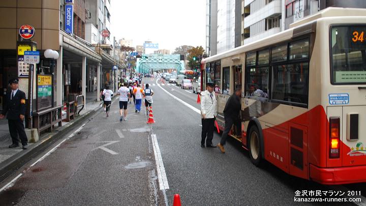 | この区間での変更点は2つ。1つはルート変更で、兼六園坂上から兼六園下〜広坂。2つめは、市庁舎前に給水所を新設。給水スタッフは専用の上着を着用しているようです。 | ||