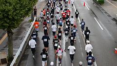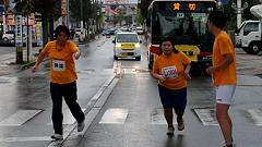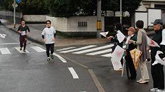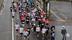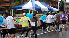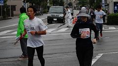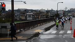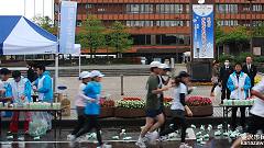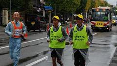 | 早朝から雨模様。前夜に準備していたカメラの雨対策をして、雨具を着る。傘やタオルなど荷物が増えたので、荷物カゴのないMTBをやめ、自転車にする。曇りならスタート会場から撮影開始の予定だったが、城南通りの歩道橋で、ランナーの来るのを待つ。Tさんと会う。ここで応援したら、有松交差点へいくとのこと。私は、今回新設された給水所を写真取材してから、フィニッシュ会場(陸上競技場)に行く予定と伝える。雨が止んでいれば、昨年撮影を予定していた犀川大橋での撮影も実現したい。 自転車を陸橋の北側の下に雨宿りさせ、道路の反対側に行く。最初はこちらから撮影し、途中で、陸橋の上から列を俯瞰撮影。陸橋を渡って、ランナーを近接撮影する手順だ。知人には応援の声をかける。 今回の大会運営での変更点は、スタート順だ。これまでは年齢順というもの。これを、17年(?)も続けてきたのだから感心する。今回はタイム申告順。大人数の大会ならば順当な手法だ。ここは競技場から大通りへの導入路が細い道なので、混雑の対応にもなる。昨年は、グランドを2周してから競技場を出た。かえってグランドでの混雑がひどくなった=昨年の写真集を参照。スタートの様子は見れなかったが、トップランナーは気持ちよく飛び出したのだろう。 撮影していてランナーの列が長く感じられる。今回は多いぞ。スタート会場にいかなかったので、参加者人数の情報を持たない。先導車から最後尾車まで8分ちょうどだった。2009年の撮影では、途中で、次の撮影スポット(下菊橋)へ移動したが、今回は最後尾まで見届け撮影した。 【編集長メモ】10kmの部の完走者は、1559名。 昨年(2010年大会)は1320名。 |