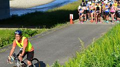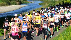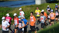 | 【2003〜2012年=大会を利用したマラソン練習】 私は日頃の練習に加え、大会を組みあわせた距離走を取り入れています。フルマラソン大会の2ケ月前となる9〜10月の大会から数回選びます。10月は、健康ランニング大会・百万石ロードレース・サイアーランニング大会の3大会が、適当な間隔で利用できます。大会で、ハーフや30kmを走った後、42kmの残り距離を追加走します。1日に42kmを走ることを2〜3回しておけば、完走の自信になります。 11月にフルマラソン大会に参加していた2008年まで、サイアーランニング大会では30kmの部に参加し、軽食後、10〜12kmを追加走していました。こうした練習経過から、4時間目標の走力の仕上がり状況を確認します。2009年秋に体調不良で入院してから、2009〜2011年は撮影取材に専念。2012年からは、暖かい時期(4〜5月)のマラソン大会に絞って参加することにしたので、晩秋のこうした練習は控えます。 【2012年大会=MTBを利用し一眼レフカメラで、その後小型カメラを携帯して取材ラン】 2012大会は、コース1周分(10km)の撮影取材後、20km程度走る予定でいました。3日前の25日に初冠雪の白山登山をしたので、脚の様子を見ながらということに作戦変更します。 8;30、30kmと20kmの部がスタートします。上流折り返し〜下流折り返し〜スタート地点までMTBを利用してランナーを追いかけます。いつ雨が降り出すか分かりません。リュックに傘とカメラの防水装置を入れています。本格的な降りになったら、MTBを置いて、防水カメラに切り替えて走る予定です。10kmまで、順調に撮影し、スタート地点に戻ります。 9:30に10kmと5kmの部のスタート写真を撮影します。先ほど撮影した御影大橋を背景にした写真にはランナーが少なかったことから、この回にも撮影をすることにします。30km・20kmの部のランナーも散らばっていますが、列に加わっているので、一番多い状況になります。 上流折り返しから戻って大豆田大橋詰の駐車場で、ランニング・ウェアに着替えます。ここから、防水カメラに持ち替えてランニングです。今回はシッカリ走ろうと、アングルの良いところに絞って撮影します。下流側を2往復しました。後で、上流側を追加走する予定でしたが、雨が降ってきたので中止です。今日の走行距離は、MTBで13km、ランで13kmとなりました。 【2015年大会からは、金沢マラソンの練習機会に】 金沢マラソンが2015年から始まりました。写真撮影マラソンにはそれなりの距離練習を確保しなければなりません。CYOR大会は9月初旬開催に変更され、金沢マラソンに備えた貴重な練習機会となりました。撮影主体から、ランナーに復帰です。金沢マラソンは、抽選にも恵まれ初回から2019年大会まで5年連続の参加しています。CYOR大会での練習距離は次の通り。MTBはスタート時の撮影用に使います。 2014年大会=20km走+MTB8KM 2015年大会=26km走+MTB4km 2016年大会=22km走+MTB6km 2017年大会=欠場=直前に帯状疱疹を発症、1ヶ月の療養。金沢マラソンも20kmまで。 2018年大会=30km走 【2019年大会は猛暑に。途中で競技中止となりました】 2019年大会は、金沢マラソン5回目の参加に備えた練習機会です。30kmの部に参加し、そのあと12kmの追加走を予定しています。9月上旬の快晴、気温がグングン上がり30℃を越しています。ペースを落として距離だけを確保する作戦にします。5月に参加した富山清流マラソンでも30℃を越す大会でした。ペースを下げれば完走できることを体験しています。 コースを1周しスタート地点にもどったところ(10km)で、競技中止の知らせです。私は、下流側コースの走者の様子を確認、中止を知らせるということで6km分を追加。大会走は16kmの練習となりました。この暑さでの追加走は74歳には無謀というもの。練習計画を修正します。金沢マラソンの直前となる10月10日の36km走で仕上げました。 【2020年は、ウィズ・コロナの大会運営が求められます】 2020年は世界的な肺炎ウィルス(新型コロナ)の感染拡大で、東京マラソンを皮切りに、大会の中止が続いています。金沢マラソン2020の中止で、走るモチベーションも下がってしまいます。CYOR大会は小規模なことから、感染対策にも対応できたということでしょう。顔なじみのランナーが走る場をえられたことは、ランナーの笑顔に表れています。 【202 金沢マラソン2021に応募。抽選をパスし、8月から練習を始めます。少しづつ距離を伸ばし、今大会で30kmの距離走。快晴、27℃の厳しい条件で後半には脚にケイレンが出て、歩きを交えてのジョグ。なんとか制限時間にフィニッシュ。参加時から3時間半〜4時間と踏んでいたのでマズマズというところ。 |