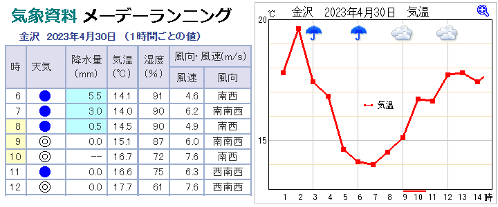 | ■メーデーランニング大会:気象データ=金沢=2023年4月30日=アメダス= |
