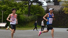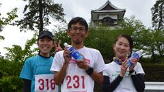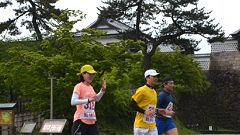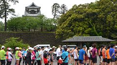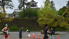 石川県勤労者体育協会の主催するランニング種目は、サイアーランニング大会とメーデー協賛ロードレース。この大会は、2011年から中央公園(教育会館)をスタートし、金沢城公園周辺と一部城内を走るコースに変更して運営されてきました。今年は開催日とコースをリニューアル。5月1日のメーデー開催日を直近の休日開催に切り替え、交通安全・警備の都合から公道コースを外し金沢城内新丸広場周回コースとしました。 前夜からの雨は小降りになっています。雨具着用でMTB(自転車)で会場に向かいます。雨はスタート前に上がりました。涼しくて走りやすい条件です。 |