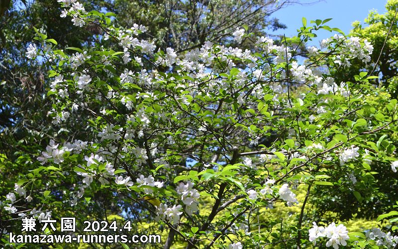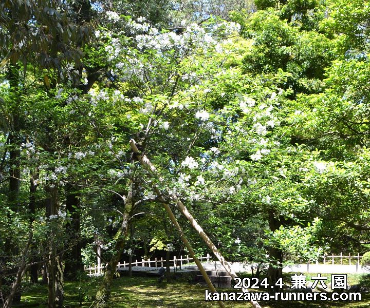 石川県勤労者体育協会の主催するランニング種目は、サイアーランニング大会とメーデー協賛ロードレース。この大会は、2011年から中央公園(教育会館)をスタートし、金沢城公園周辺と一部城内を走るコースに変更して運営されてきました。昨年(2023年)、開催日とコースをリニューアル。5月1日のメーデー開催日を直近の休日開催に切り替え、交通安全・警備の都合から公道コースを外し金沢城内新丸広場周回コースとしました。 ゴールデンウィーク中の開催。雲一つない晴天、気温も上昇しています。MTB(自転車)で会場入り。兼六園・金沢城公園は観光客でにぎわっています。大会後、外国語が飛び交う兼六園を散策しました。新緑と白い花を愛でます。 |
