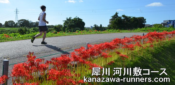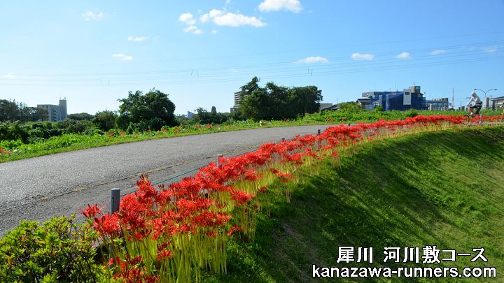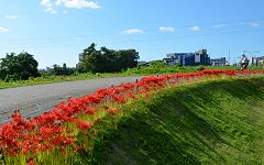 | 大会記録の撮影では、犀川河川敷コースの秋の気配を組み込んで撮影しています。 ゆったりパーク下流の登坂。彼岸花が満開です。台風一過の青空、花はみずみずしく咲いています。ここから下流の自転車路は、両側の雑草がキレイに刈られて、気持ち良いコースに仕上がっています。=撮影:2021.9.19= |