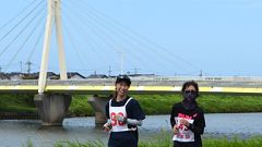 | マラソンに挑戦する会2024=2024年9月16日(月/祝) 北陸新幹線の金沢〜敦賀間は2024年3月に開業。今日で半年が経過しました。 長野〜金沢間が開業したのは2015年。犀川に架かる新幹線橋は、この時から使用されていましたが、営業車両は3月から。かねてから、新幹線車両の通過とマラソン大会との組み合わせを考えていましたが、初めての機会を迎えました。新幹線時刻表から通過予定表を準備。スタート時から5km経過。ランナーの通過配置を予想します。200人弱の参加者なので、列が細くなったり、後ろ姿になるようです。1周(10km)で終えるランナーも多いので、最初の周回時に撮影します。 撮影位置は上流側と下流側とで下見してあります。問題は、騒音壁。撮影位置を高くしないと車両が見えないのです。周辺に利用できそうな高い建物はありません。太陽の位置から上流側が順光になります。上流側を優先し、河川敷き横(上)の歩道から。次に下流側・大豆田大橋から逆光での撮影と順序を決めます。 |