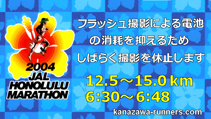 | ホノルルマラソンはまさにお祭りだ。被写体があふれています。2003年大会では『マラソンを楽しむ自分自身』を被写体にしました。走りを進める中で、次回はボランティアと応援をテーマに撮りたいと感じていました。この時は初マラソンでもあり5時間以内の目標設定もありました。一番の制約はカメラとフィルム。フィルム1本分の撮影でも、自分自身を被写体にすると、撮影依頼などの時間に15〜30分はかかります。撮りたいのを我慢しながらも、どんな応援があるのか、観察しながら走ります。とても楽しい時間でもあったのです。 2004年大会での撮影テーマは、『25,000人の中で走る楽しみ。そしてボランティアと応援。』です。当然撮影枚数も多くなります。今回の撮影装備は、500万画素デジタルカメラ。レンズは28mmの広角〜85mmの望遠ズーム(35mmカメラ相当)。これに512MBのメモリーカードを装着。撮影画素数は1280×640ピクセルに設定します。これ以上のサイズでは、カードへの書き込み時間が長くなって、次の撮影に影響が出るので、我慢のしどころです。撮影画素数を小さくしても、受像画素数の大きいカメラの方がよりキレイに撮れます。カメラの重たい分は、練習で体力をカバーします。 マラソン中に150枚くらい撮影すると、150×10秒=25分。目標タイムは、あくまで5時間以内を守りたい。しかし、今回は写真マラソンを楽しむことが第一目標。撮影したいものを逃すことの方が悔いが残ると思い、4時間45分〜5時間15分の間と大まかに設定。この時間帯の走行ペース表を用意しました。 |