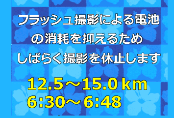 | ホテル街など建物のライトアップやクリスマス飾りなど撮影を予定していますが、ランナーと組み合わせて撮りたいものです。これにはコース中にジグザク横断が必要になります。混雑した流れの中、そして暗いなかランナーに迷惑のかかる危険な行動です。少しづつ横移動して歩道など安全地帯で撮影します。 ストロボの光量もあります。ランナーの列やエイドステーションを狙います。近くは明るくなりますが奥行きまでとらえることはできません。光らせた分、被写体深度にあわて絞りが小さくなるからです。 ストロボを使わない撮影もします。三脚を持たないので交通標識にカメラを押し付けてカメラブレを防ぎますが、丸いポールでなかなか上手くいかないものです。 カメラの電源は単3電池2本です。充電式でアルカリ電池の数倍の撮影が可能ですが、ストロボは電池の消耗を早めます。多くを望まないのがよさそうです。 |