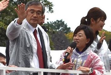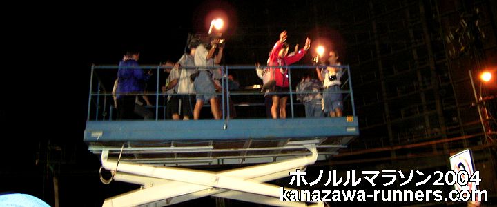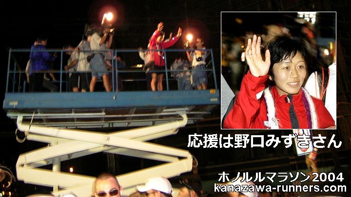 スタートラインの応援は昨年(2003)に続き野口みずきさん。今年(2004年8月)のアテネ五輪の金メダリストです。暗い中、高所で応援する姿をシッカリした写真を撮るには難しい状況です。金メダリストを撮影したい。2年後、金沢百万石RR2006の招待選手で撮影出来ました。2015年新設の金沢マラソンでは、野口さんは招待選手の1人。スタート応援をシッカリ撮影しています。そして幸運にもフィニッシュ会場で2ショットのチャンスがありました。 【余談】シドニー五輪2000の金メダリスト・高橋尚子さんは、金沢RRで2回撮影しています。コース内で近くにカメラマンのいない状況。撮影を独占しました。 |