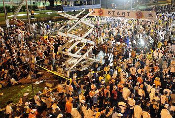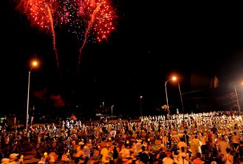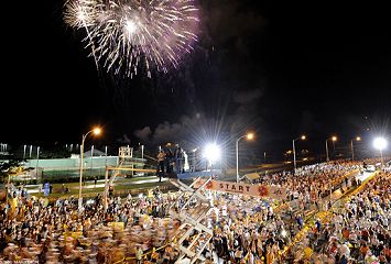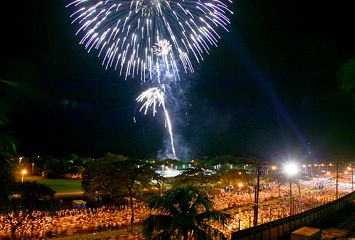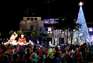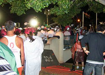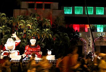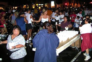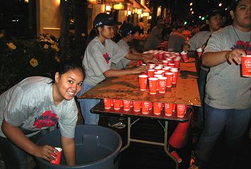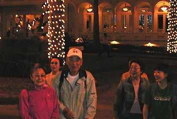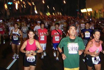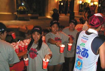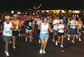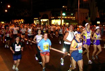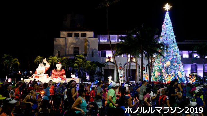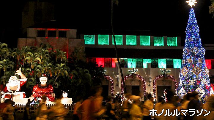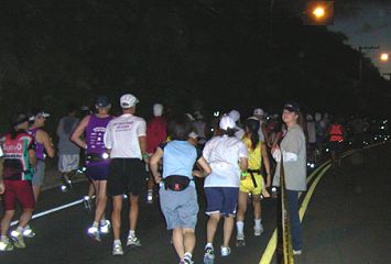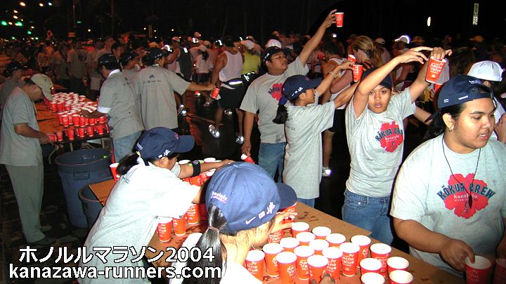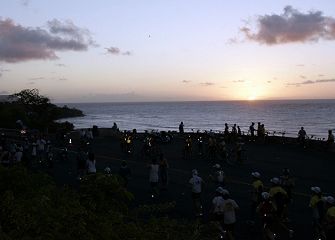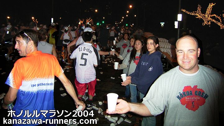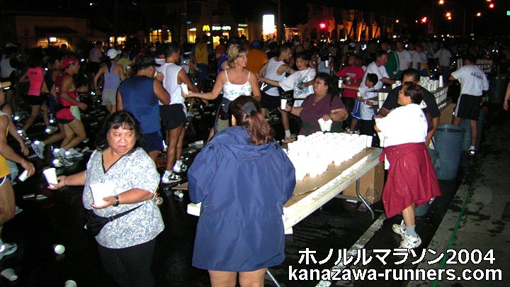 スタートは5:00。合図の花火が揚がります。写真マラソンの開始です。この花火は、後ほどキレイなものが揚がります。列が動き始めるので、最初の1〜2枚を撮影するのがやっとです。チョット残念です。そして走りのペースに乗せるために25〜30分くらいは、撮影をしません。カメラはウェストポーチにしまいます。薄くらい街をペースを確認しながら黙々と走ります。こうして走る体を作っておくと、撮影に立ち止まってもスピード感覚は維持できます。日の出は7時頃なので薄明かるくなるまで、1時間半は暗い中を走ります。ストロボを使うと電池の消耗が大きいので、後半の撮影用に控えることも必要です。暗い間は、給水所を中心に撮影することにしています。また、コースの途中で立ち止まると、とても危険です。視界の悪い間は撮影を控えるのがエチケットです。路肩や歩道に行って撮影します。 スタートからワイキキ通りまでは、ホテルやクリスマスの飾り付けなどのイルミネーションが被写体です。そして、暗い中を黙々と走るランナー。2マイルをすぎると最初のエイドステーション。ここからボランティアの登場です。 |