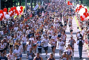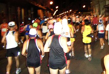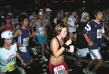 | スタートして1kmを過ぎると、周囲の空間に余裕ができてきます。周囲を観察しながら走ります。オッ、ビデオカメラを持ったお嬢さんだ。走りながら撮影しています。デジタルビデオの撮影時間は、テープや電池の制約で約1時間で交換が必要です。ウェストポーチも小さく、交換部品もなさそうです。そしてカメラより重たいのです。他人事ながら心配になります。『ずっと撮るの?』。『走りながらだからブレて、うまく撮れないです。途中で、カメラを渡します。』。『では、ガンバッテね』。 | ||||||||||||||||
