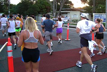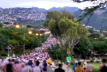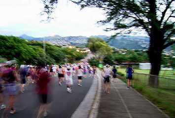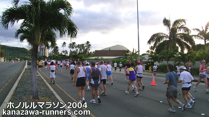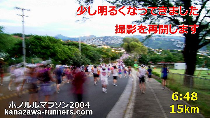 | 少し明るくなった。ダイアモンドヘッドを周回し、右折すると、ランナーの列をとらえられる。 | |